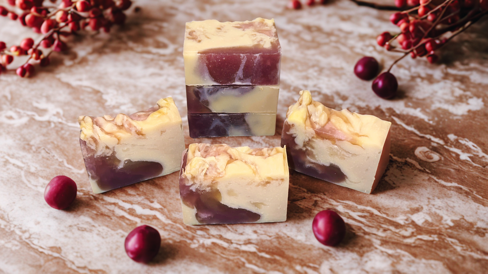 A softly enchanting bar that blends creamy warmth with hints of sweet plum and spice. Its delicate swirl of mauve and ivory captures the beauty of the season — comforting, graceful, and a little bit magical. Each lather feels like a cozy evening glow, wrapping your skin in silky moisture and a whisper of sweetness.